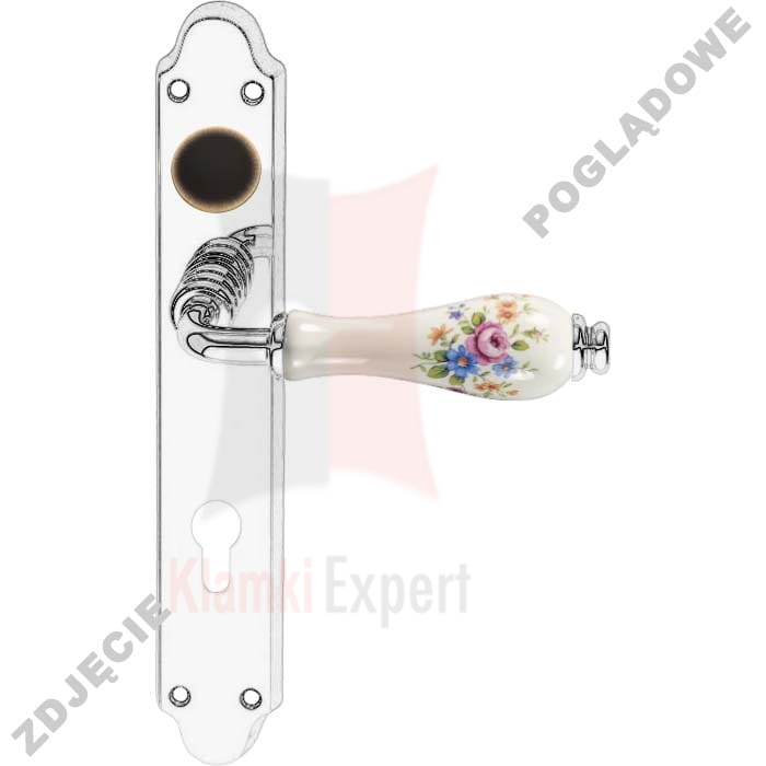 Klamka DALIA 660 szyld długi z otworem na wkładkę (porcelana biała, kwiaty wiosenne)