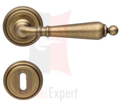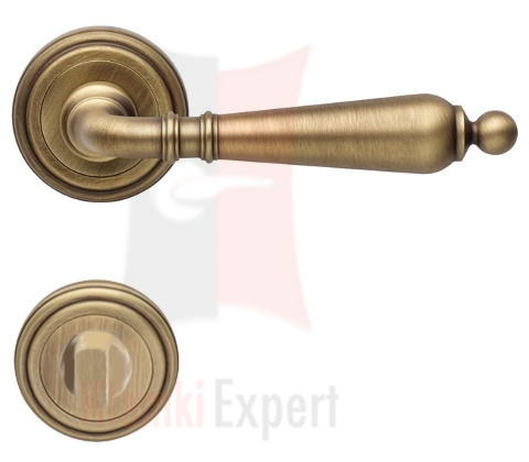 Klamka Florenzia wykonana jest z mosiądzu w kolorze PM brązowiony matowy jasny na rozecie okrągłej 101 i dostępna jest we wszystkich konfiguracjach: z dolna rozetą na klucz zwykły, wkładkę patentową (bębenkową) oraz z blokadą WC (łazienkową).