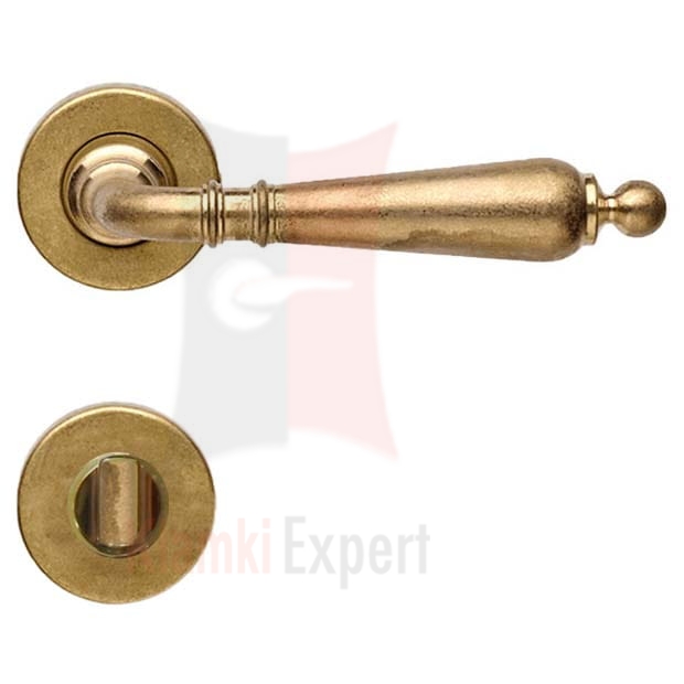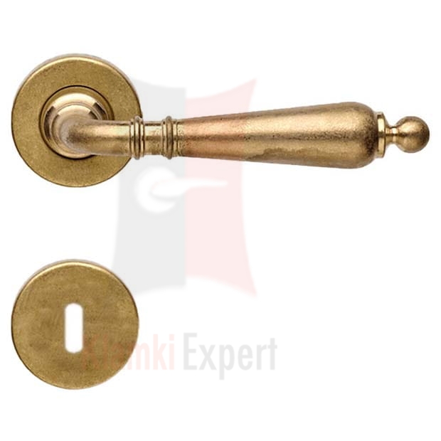 Klamka Florenzia wykonana jest z mosiądzu w kolorze VB "mocny" mosiądz na rozecie okrągłej 101 i dostępna jest we wszystkich konfiguracjach: z dolna rozetą na klucz zwykły, wkładkę patentową (bębenkową) oraz z blokadą WC (łazienkową).