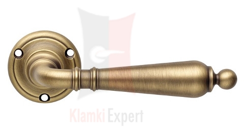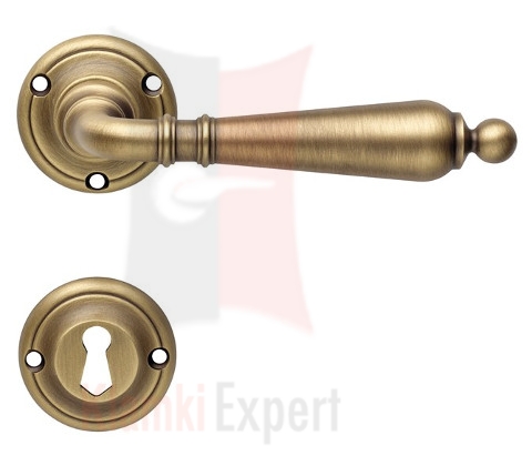 Klamka Florenzia wykonana jest z mosiądzu w kolorze PM brązowiony matowy jasny na rozecie okrągłej 110 i dostępna we wszystkich konfiguracjach: z dolna rozetą na klucz zwykły, wkładkę patentową (bębenkową) oraz z blokadą WC (łazienkową).
