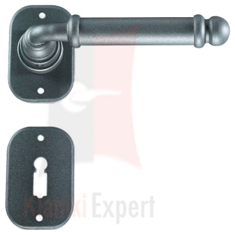 Klamka Klamka Lisbona 2105 z dolną rozetą na klucz zwykły wykonana jest z ręcznie kutego żelaza i dostępna w trzynastu powłokach kolorystycznych. Pozwala to dobrać kolor klamki do charakteru wnętrza lub do kolorystyki drzwi i okien.