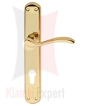 Opis produktu: kpl. klamek na szyldzie podłużnym z otworem na zwykły klucz lub wkładkę patentową ilość: 1 kpl. (2 szt.) materiał: mosiądz wymiary: długość rękojeści 120 mm, szerokośc szyldu 42 mm, długość 250 mm dwie sprężyny powrotne, klamka zawsze ...