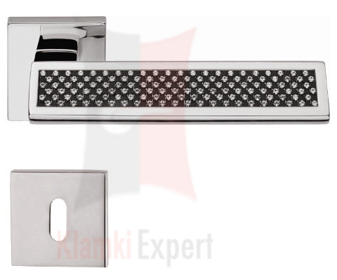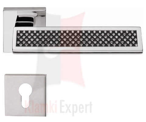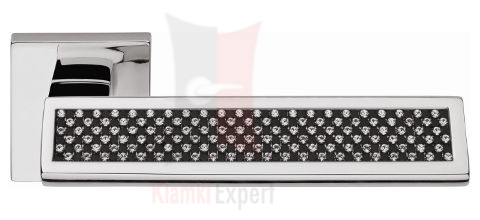 Klamka Riflesso Black wykonana jest z mosiądzu chromowanego i ozdobiona kryształkami Swarovskiego Produkowana jest na rozecie kwadratowej nr 019. Wykończenie (kolor) CR chromowany błyszczący. Klamka dostępna jest we wszystkich konfiguracjach: bez dolnej rozety, z rozetą na klucz zwykły, wkładkę patentową (bębenkową) lub z blokadą WC (łazienkową). Produkt oryginalnie włoski, wyprodukowany przez firmę Linea Cali srl z siedzibą we Włoszech.