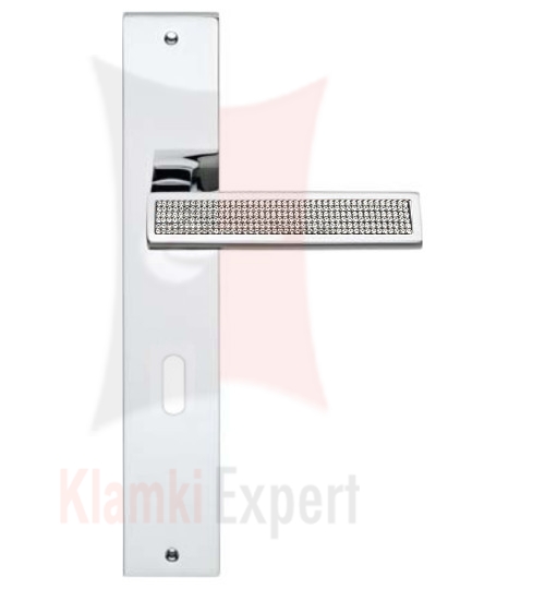 Klamka Riflesso Mesh wykonana jest z mosiądzu i ozdobiona kryształkami Swarovskiego Produkowana jest na szyldzie długim z otworem na klucz. Rozstaw 72, 90 i 92 mm (Jak wymierzyć rozstaw). Produkt oryginalnie włoski, wyprodukowany przez firmę Linea Cali srl z siedzibą we Włoszech.